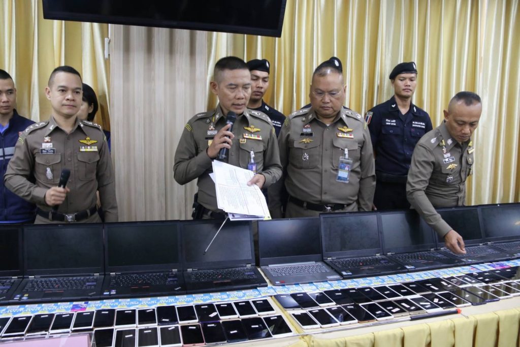จากการตรวจสอบห้องพักที่ใช้เป็นห้องทำงาน พบของกลางเป็นอุปกรณ์ที่ใช้ในการกระทำความผิด เช่น โทรศัพท์มือถือ จำนวนกว่า 200 เครื่อง,คอมพิวเตอร์โน๊ตบุ๊ค จำนวน 40 เครื่อง แผ่นกระดาษและสมุดจดบันทึกเป็นภาษาจีน (บันทึกการปฏิบัติในแต่ละวัน) จำนวนมาก ซึ่งของกลางในส่วนนี้ทางเจ้าหน้าที่ตำรวจชุดจับกุมจะได้สอบถามไปยังเจ้าหน้าที่ตำรวจสาธารณรัฐประชาชนจีน เพื่อทำการร่วมตรวจสอบและหาพยานหลักฐานเพิ่มเติม เพื่อใช้เป็นหลักฐานในการดำเนินคดีกับผู้ต้องหาทั้งในส่วนของความผิดที่เกี่ยวกับกฎหมายประเทศไทยและที่เป็นความผิดเกี่ยวกับกฎหมายในประเทศสาธารณรัฐประชาชนจีน