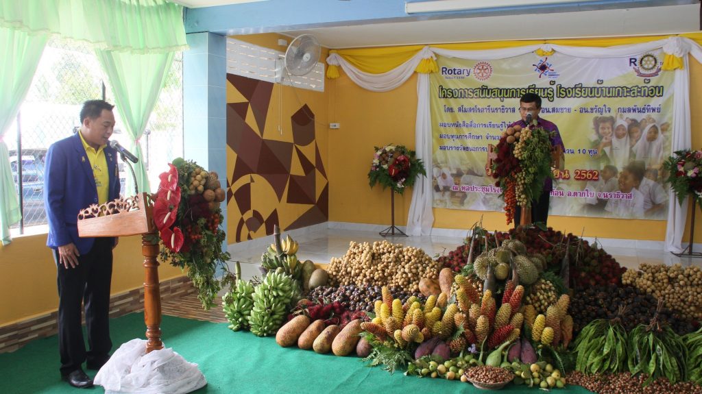 นายธรรมรงค์ คงวัดใหม่ รองผู้ว่าราชการจังหวัดนราธิวาส กล่าวว่า การจัดกิจกรรมมอบหนังสือสื่อการเรียนรู้ให้ห้องสมุด และทุนการศึกษาแก่นักเรียนโรงเรียนบ้านเกาะสะท้อน จะช่วยให้เกิดขวัญกำลังใจในการศึกษาเล่าเรียน ซึ่งโรงเรียนในภาครัฐยังคงต้องการการส่งเสริมจากภาคส่วนต่าง ๆ โดยเฉพาะภาคเอกชน ซึ่งสโมสรโรตารีจังหวัดนราธิวาสได้ให้การสนับสนุนหนังสือ ทุนการศึกษา และเงินรางวัลแก่ผู้ที่ชนะเลิศทางวิชาการ โดยเป็นการให้ความสำคัญกับเด็กและเยาวชน รวมทั้งภาคการศึกษา ช่วยส่งเสริมการเป็นคนดีของสังคม โดยมอบหนังสือให้ห้องสมุดเพื่อเป็นแหล่งเรียนรู้ รวมทั้งช่วยพัฒนาการเรียนการสอน ซึ่งเป็นการแบ่งปันน้ำใจตามโครงการสนับสนุนการเรียนรู้ ที่เป็นกิจกรรมเพื่อสังคม