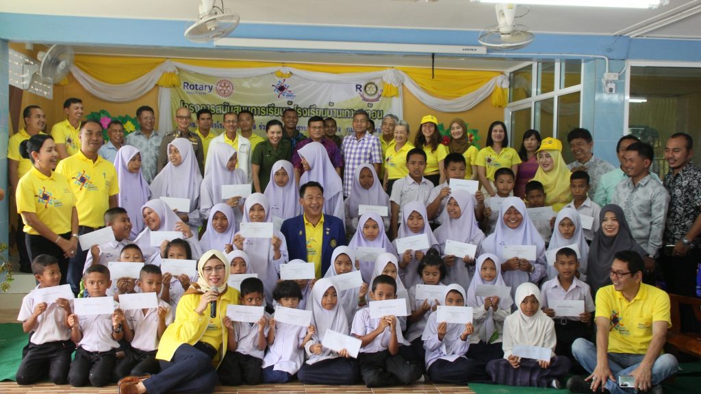 ทั้งนี้สโมสรโรตารีนราธิวาส ร่วมกับ อน.สมชาย-อน.ขวัญใจ กมลพันธ์ทิพย์ ร่วมกันจัดกิจกรรมมอบหนังสือและสื่อการเรียนรู้ให้ห้องสมุดโรงเรียนบ้านเกาะสะท้อน มอบทุนการศึกษา จำนวน 35 ทุน ๆ ละ 1,000 บาท และมอบรางวัลการแข่งขันการประกวดในกลุ่ม 8 สาระการเรียนรู้ จำนวน 10 ทุน ๆ ละ 1,000 บาท เพื่อสนับสนุนการเรียนการสอน และเป็นกำลังใจให้นักเรียนโรงเรียนบ้านเกาะสะท้อน โดยโรงเรียนบ้านเกาะสะท้อน จังหวัดนราธิวาส เปิดการเรียนการสอนในระดับอนุบาลถึงมัธยมศึกษาปีที่ 3 เป็นโรงเรียนขยายโอกาส มีจำนวนนักเรียนประมาณ 600 กว่าคน มีบุคลากรทางการศึกษา 60 คน จัดการเรียนการสอนทั้งในระดับสามัญและอิสลามแบบเข้ม