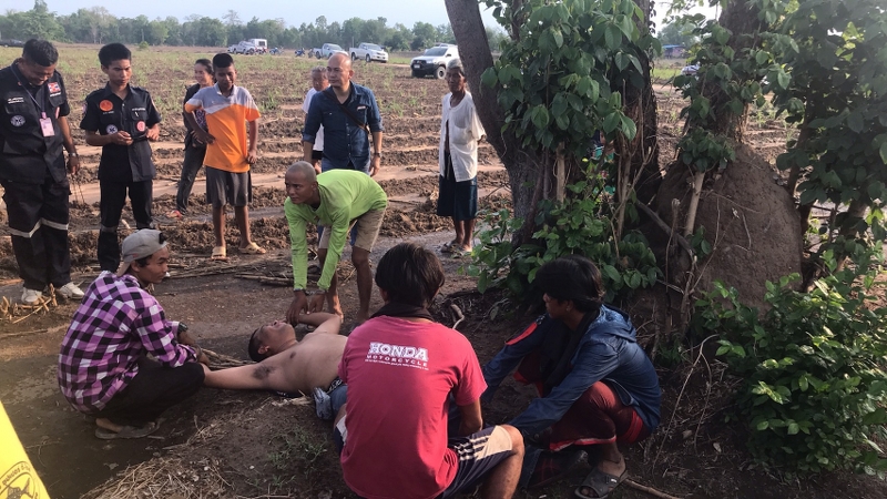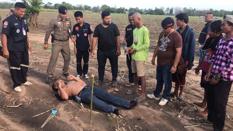 ซึ่งเป็นไร่อ้อยของนายอุดม มังกรประดิษฐ์ อายุ 69 ปี โดยสภาพศพของนานอูเหม่าอูฯ นั้นอยู่ในสภาพนอนหงาย สวมกางเกงขาสั้นสีแดงลายดอก ไม่สวมเสื้อ ไม่สวมรองเท้ามีบาดแผลเป็นรูลึกที่หน้าอกและสีข้างจำนวนหลายรู ลำคอมีบาดแผล กว้าง ศีรษะมีรอยบวมโน จากการสอบถามพยานบุคคลต่างๆทราบว่านายอูเหม่าอู นั้นพึ่งเข้ามาทำงานรับจ้างอยู่ในไร่อ้อยดังกล่าวประมาณ 1 เดือน