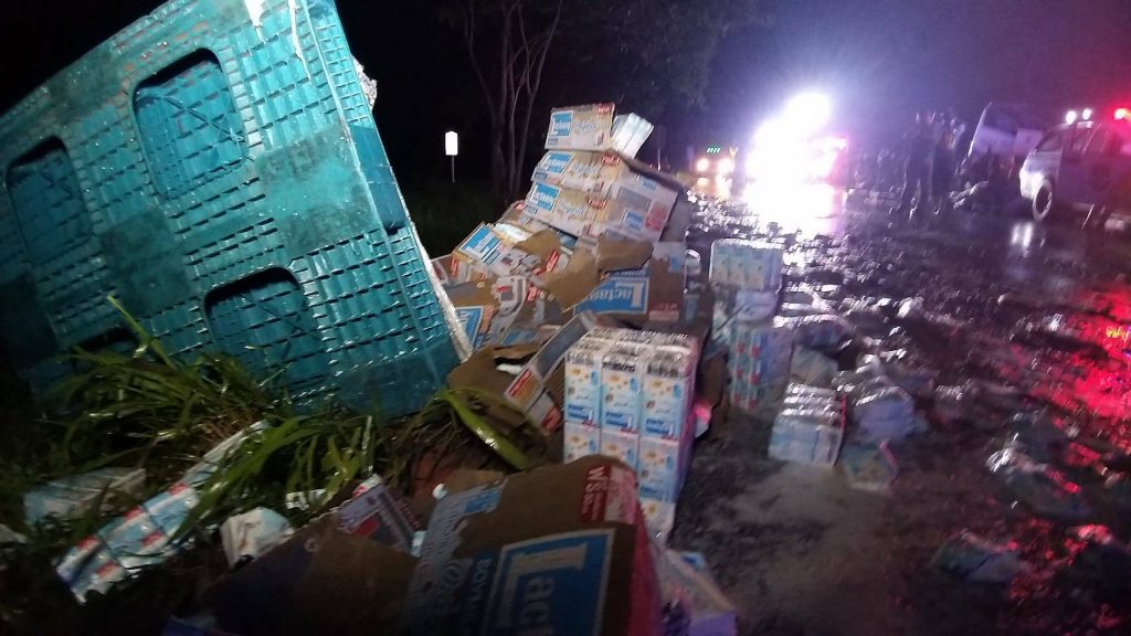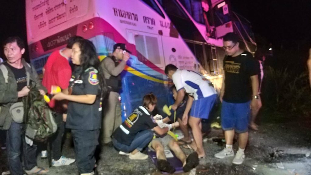 ในที่เกิดเหตุพบรถทัวร์โดยสารปรับอากาศชั้น 1 เป็นรถนอน 2 ชั้น หนองคาย-ตราด ม. 4 ข. สีฟ้า ชาว หมายเลขข้างรถ 590-12 ทะเบียน 10-7775 อุดรธานี ของบริษัท 407 พัฒนา จำกัด สภาพรถด้านหน้าพังยับเยินตกลงร่องน้ำข้างทางฝั่งขาเข้ากบินทร์บุรี ภายในรถมีผู้โดยสารที่นั่งมาด้วยจำนวนกว่า 40 คน หนีตายออกมาจากตัวรถอย่างโกลาหล และมีผู้ได้บาดเจ็บอยู่ในรถอีกจำนวนหลายราย เจ้าหน้าที่หน่วยกู้ภัยฯได้ช่วยเหลือออกมาจากตัวรถปฐมพยาบาลก่อนนำส่ง รพ.กบินทร์บุรี รพ.นาดี/ และ /รพ.ศรีมหาโพธิ ส่วนบนท้องถนนมีนมถั่วเหลืองบรรจุกล่องแลคตาซอยตกหล่นเกลื่อนถนน กีดขวางการจราจร 1 ช่องทาง