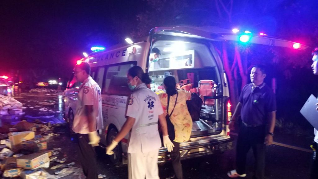 เมื่อเวลา 01.30น.วันที่ 14 กันยายน 2562 ร.ต.อ.ประยงค์ หม่อมวงศ์สุวรรณ รอง.สว.(สอบสวน) สภ.สระบัว รับแจ้งอุบัติเหตุรถทัวร์โดยสารชนกับรถบรรทุกพ่วง 18 ล้อ ในที่เกิดเหตุมีผู้ได้รับบาดเจ็บจำนวนหลายราย ที่เกิดเหตุบนถนนสาย 304 กบินทร์บุรี –นครราชสีมา หน้าศูนย์วิจัยสัตว์ปีก กม. 155 ม. 3 ต.ลาดตะเคียน อ.กบินทร์บุรี จ.ปราจีนบุรี หลังรับแจ้งพร้อมด้วยเจ้าหน้าที่หน่วยกู้ภัยมูลนิธิสัจจะพุทธธรรมกบินทร์บุรี กู้ชีพ รพ.กบินทร์บุรี รุดตรวจสอบยังที่เกิดเหตุ