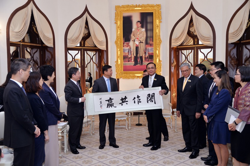 อนึ่งในตอนท้าย รัฐมนตรีว่าการกระทรวงวิเทศสัมพันธ์ฯ ได้มอบแผ่นป้ายภาษาจีน “เหอจั้วก้งอิ๋ง” ที่มีความหมายว่า “ความร่วมมือที่ให้ประโยชน์กับทุกฝ่าย” แด่นายกรัฐมนตรี