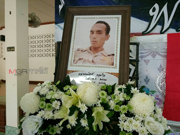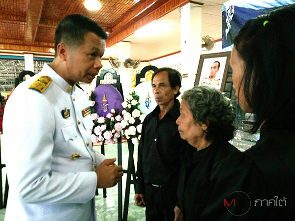 วันนี้ (18 ก.ค.) ที่วัดปุหลน ต.ช้างให้ตก อ.โคกโพธิ์ จ.ปัตตานี สมเด็จพระเจ้าอยู่หัว ทรงพระกรุณาโปรดเกล้าโปรดกระหม่อมให้ นายสมนึก พรหมเขียว รองผู้ว่าราชการจังหวัดปัตตานี อัญเชิญพวงมาลาหลวงไปวางที่หน้าหีบศพ นายพงศักดิ์ ยอดใจ อายุ 30 ปี อาสาสมัครกองรักษาดินแดน เจ้าหน้าที่ชุดคุ้มครองตำบลนาประดู่ ที่เสียชีวิตจากการปฏิบัติหน้าที่ สร้างความปลาบปลื้มแก่ครอบครัวอย่างหาที่สุดมิได้