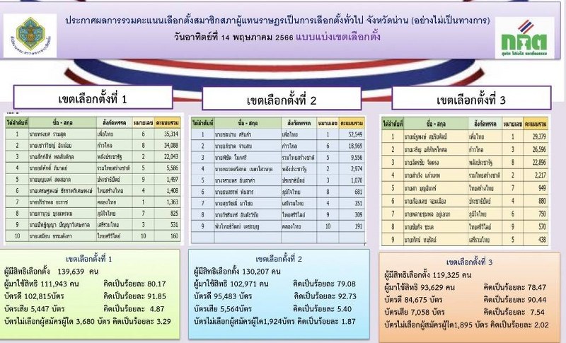 เมื่อวันที่ 15 พฤษภาคม 2566 เวลา 05.45 น. ปรากฏว่า ส.ส. พรรคเพื่อไทย ชนะขาดลอย เข้าวิน ทั้ง 3 เขตเลือกตั้ง ภาพรวมของจังหวัดน่าน ได้สรุปผลคะแนนแบบบัญชีรายชื่อ จังหวัดน่าน มี 3 เขตเลือตั้ง หน่วยเลือกตั้งทั้งหมด 926 หน่วย 67 พรรคการเมือง