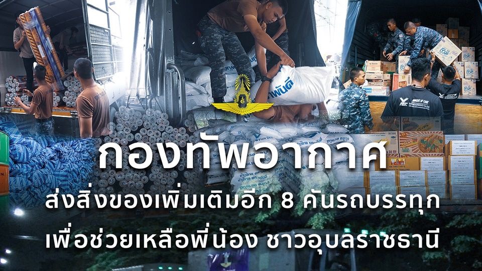 กรุงเทพฯ 21 ก.ย.- กองทัพอากาศ เดินหน้าช่วยเหลือต่อเนื่อง ส่งสิ่งของเพิ่มเติมอีก 8 คันรถบรรทุก เพื่อช่วยเหลือชาวอุบลราชธานี