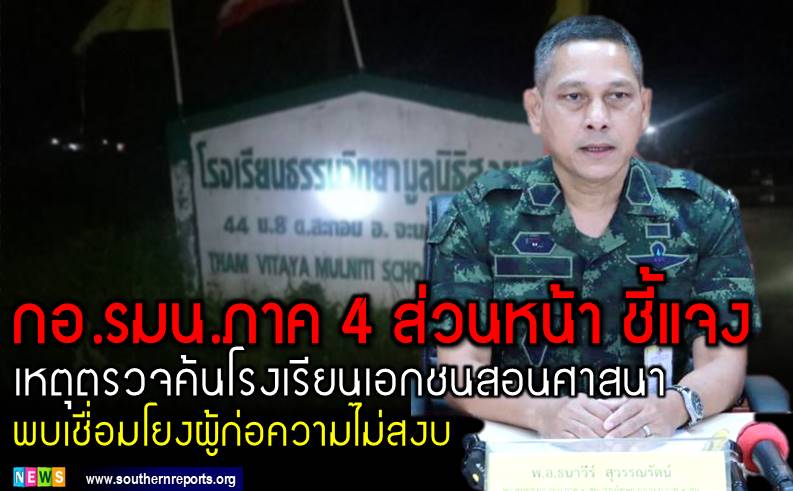 จากกรณีเจ้าหน้าที่ได้เข้าตรวจค้นโรงเรียนเอกชนสอนศาสนาแห่งหนึ่งในพื้นที่ อ.จะนะ จ.สงขลา เมื่อวันที่ 15 กันยายนที่ 2562 ผ่านมา นั้น ล่าสุด พันเอกธนาวีร์ สุวรรณรัตน์ รองโฆษก กองอำนวยการรักษาความมั่นคงภายในภาค 4 ส่วนหน้า เปิดเผยว่า จากการกรณีที่เจ้าหน้าที่ได้เข้าไปทำการตรวจค้นโรงเรียนธรรมวิทยามูลนิธิสงขลา ต.สะกอม อ.จะนะ จ.สงขลา เมื่อวันที่ 14 ก.ย. 2562 ที่ผ่านมา สืบเนื่องจากเจ้าหน้าที่ได้ติดตามและบังคับใช้กฎหมายบุคคลต้องสงสัยว่ามีส่วนเกี่ยวข้องกับเหตุคนร้ายปล้นร้านทองสุธาดา อ.นาทวี จ.สงขลา เหตุเกิด เมื่อวันที่ 24 ส.ค. 2562 ซึ่งปรากฏความเคลื่อนไหวของ นายไซนูรอาบาเซร์ สุหลงเส็น ซึ่งมี หมาย ป.วิ อาญา จำนวน 3 หมาย เข้ามาหลบซ่อน/พักพิง ภายในบ้านพักครู โรงเรียนธรรมวิทยามูลนิธิสงขลา ต.สะกอม อ. จะนะ จ.สงขลา ซึ่งเป็นบ้านพักของ น.ส.นูรยานิง อาฆง อายุ 34 ปี มีภูมิลำเนา บ้านเลขที่ 94 ม.2 ต.บ้านนา อ.จะนะ จ.สงขลา เพื่อเตรียมการก่อเหตุสร้างสถานการณ์ในพื้นที่