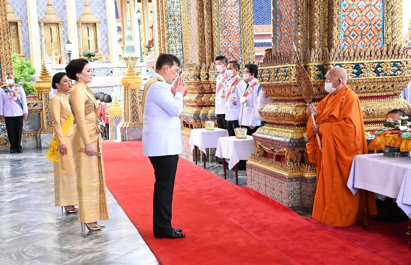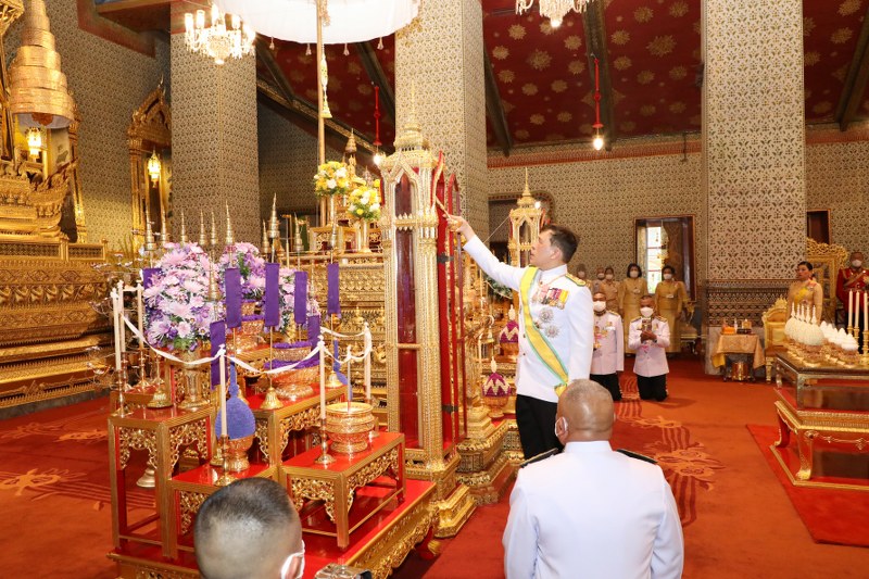 เมื่อเสด็จพระราชดำเนินถึง พระบาทสมเด็จพระเจ้าอยู่หัว เสด็จขึ้นชานหน้าพระอุโบสถ ทรงรับการถวายพระพรของบรรพชิตญวนและจีน แล้วเสด็จเข้าพระอุโบสถ ทรงจุดเทียนพระมหามงคลที่ตั้งอยู่บนธรรมาสน์ศิลา เทียนเท่าพระองค์ในตู้ข้างธรรมาสน์ศิลา ด้านพระพุทธยอดฟ้าจุฬาโลกย์ เทียนเท่าพระองค์ในตู้ข้างธรรมาสน์ศิลา ด้านพระพุทธเลิศหล้านภาไลย ธูปเทียนท้ายที่นั่งบูชาพระพุทธมหามณีรัตนปฏิมากร พระพุทธยอดฟ้าจุฬาโลกย์ พระพุทธเลิศหล้านภาไลย เสร็จแล้ว ทรงจุดธูปเทียนเครื่องนมัสการทองใหญ่ ที่หน้าธรรมาสน์ศิลา สมเด็จพระนางเจ้า ฯ พระบรมราชินี ทรงจุดธูปเทียนเครื่องนมัสการทองทิศ พระบาทสมเด็จพระเจ้าอยู่หัว ทรงจุดเทียนที่โต๊ะหน้าอาสน์สงฆ์ พระสงฆ์เจริญพระพุทธมนต์นวัคคหายุสมธัมม์ และทรงจุดเทียนที่บัตรเทวดานพเคราะห์บนแท่นซึ่งตั้งอยู่ตรงพระทวารกลาง แล้วเสด็จลงชานหน้าพระอุโบสถ พระราชทานพระบรมราชวโรกาสให้ ข้าทูลละอองธุลีพระบาท ผู้สูงอายุฝ่ายหน้า ฝ่ายใน เฝ้าทูลละอองธุลีพระบาท รับพระราชทานราชสังคหวัตถุ เสร็จแล้ว เสด็จพระราชดำเนินไปยังพระที่นั่งอมรินทรวินิจฉัย