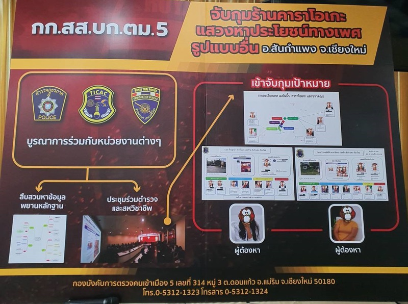 โดยเมื่อวันที่ 5 ก.ย.62 เจ้าหน้าที่กก.สส.บก.ตม.5, กก.4 บก.สส.ภ.5, สภ.สันกำแพง,คณะทำงานปราบปรามการละเมิดเด็กทางอินเทอร์เน็ต (TICAC), เจ้าหน้าที่องค์กรเอกชน (NGO) และทีมสหวิชาชีพ ได้ร่วมกันวางแผนเข้าจับกุมสถานประกอบการดังกล่าวข้างต้น พบเด็กสาวที่มีอายุต่ำกว่า 18 ปี ร้านลูกน้ำคาราโอเกะ 3 คน ร้านเมย์&มิ้นคาราโอเกะ 1 คน