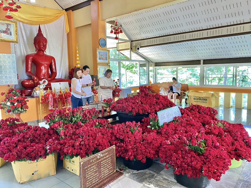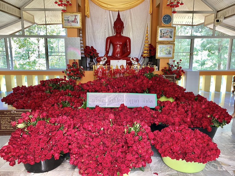 เมื่อช่วงบ่าย 14.00 น. วันที่ 25 สิงหาคม 2566 เจ้าของบริษัท นิปปอน คุรุมา จํากัด ได้เดินทางนำดอกกุหลาบสดสีแดงจำนวน 10,000 ดอก มาไหว้แก้บนหลวงพ่อแดง พร้อมด้วยชุดไทยหลากหลายสี จํานวน 1,000 ชุด มาบนไหว้ศาลเจ้าแม่เขาล้านไว้ โดยมีรถยนต์ของเจ้า ของบริษัท นิปปอน คุรุมา จํากัด กทม.นํากุหลาบมาจาก กทม.มาใหม่ๆ มาส่งด้วยรถจำนวน 4-5 คันจาก กรุงเทพมหานคร ก่อนจะช่วยกันเรียงดอกกุหลาบนานนับชั่วโมง เพื่อให้เจ้าของบริษัทมาแก้บนทันช่วงที นายเพชรสวัสดิ์ ราชพิบูลย์ กับภรรยา นางวาสสนา ฝั้นสืบ พร้อมครบครัวและพนังงานลูกจ้างกว่า 50 คน