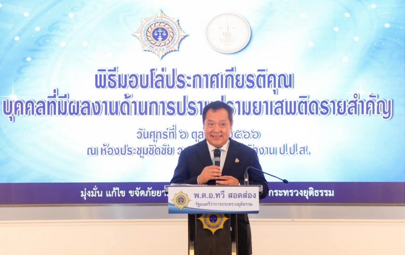วันที่ 6 ตุลาคม 2566 ที่ห้องประชุมชิดชัย วรรณสถิตย์ สำนักงาน ป.ป.ส. เวลา 11.00 น. พ.ต.อ.ทวี สอดส่อง รัฐมนตรีว่าการกระทรวงยุติธรรม เป็นประธานในพิธีมอบโล่ประกาศเกียรติคุณบุคคลที่มีผลงานด้านการปราบปรามยาเสพติดรายสำคัญ โดยมี นายกูเฮง ยาวอหะซัน เลขานุการรัฐมนตรีว่าการกระทรวงยุติธรรม, พล.ต.ท.ภาณุรัตน์ หลักบุญ ผู้ช่วยผู้บัญชา การตำรวจแห่งชาติ, นายธนากร คัยนันท์ รองเลขาธิการ ป.ป.ส., นายสหการณ์ เพ็ชรนรินทร์