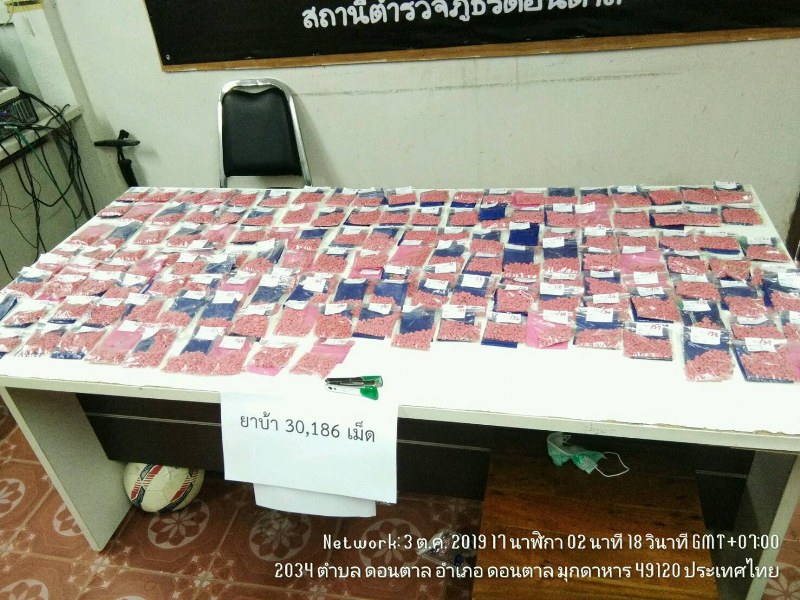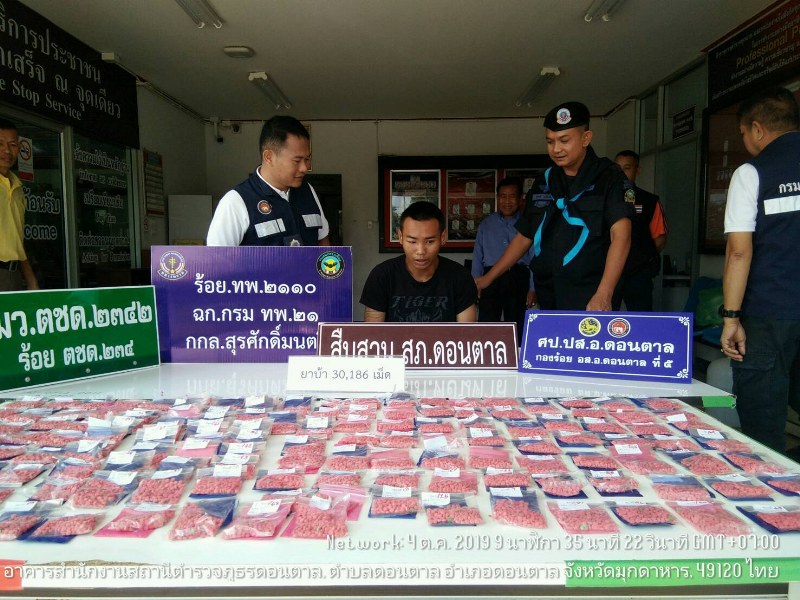 เมื่อวันที่ 4 ตุลาคม 2562 เวลา 09.00 น สถานีตำรวจภูธรอำเภอดอนตาล โดยการอำนวยการของ พ.ต.อ.อลงกรณ์ เสนีย์รณฤทธิ์ ผกก.สภ.ดอนตาล, พ.อ.สุภัทร ชูตินันทน์ ผบ.ฉก.ทพ.21, นายยุคล กาญจนศิริพงษ์ นายอำเภอดอนตาล ได้สั่งการให้ ตำรวจชุดปราบปรามยาเสพติดเจ้าหน้าที่ทหารพรานที่ 2110, มว.ตชด.2342 และฝ่ายปกครอง ร่วมกันตรวจค้นจับกุมขบวนการค้ายาเสพติดในพื้นที่อำเภอดอนตาล ได้ของกลาง จำนวน 15 มัด รวม 30,186 เม็ด พร้อมรถจักรยานยนต์ Yamaha MT-07 สีดำ ไม่ติดแผ่นป้ายทะเบียน จำนวน 1 คัน โดยกล่าวหาว่า มียาเสพติดให้โทษประเภท 1 ยาบ้าไว้ในครอบครอง เพื่อจำหน่ายโดยผิดกฎหมาย เหตุเกิดที่บริเวณ ข้างร้านไข่มุกวัสดุก่อสร้าง บ้านนาโพธิ์ ตำบลโพธิ์ไทร อำเภอดอนตาล จังหวัดมุกดาหาร พิกัด VD 871079
