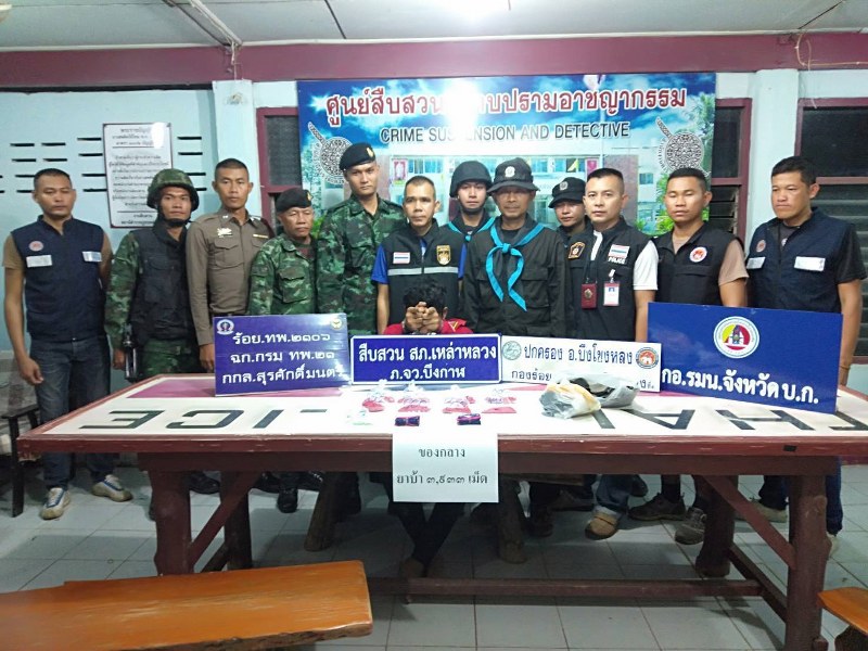 เจ้าหน้าที่จึงได้แสดงตัวเข้าตรวจค้นชายดังกล่าว ต่อมาชายดังกล่าวได้ตกใจแล้วทิ้งสิ่งของวิ่งหลบหนีไปได้ประมาณ 10 เมตร เจ้าหน้าที่จึงควบคุมตัวไว้ได้ คือนายภาคภูมิ ค่อยชัยภูมิ อายุ 20 ปี อยู่บ้านเลขที่ 11 หมู่ 2 บ.ดงสรวง ต.ดงบัง อ.บึงโขงหลง จ.บึงกาฬ และได้นำตัวไปตรวจสอบสิ่งของที่ทิ้งไว้ พบว่าเป็นยาบ้า จำนวน 2 มัด โดยบรรจุใส่ถุงพลาสติกสีฟ้าแบบ กดปิด – ดึงเปิด จำนวน 16 ถุง และสีชมพู จำนวน 4 ถุง รวมแล้วได้ 20 ถุง ตรวจนับแล้วได้ของกลางยาบ้า จำนวน 3,933 เม็ด ( สีส้ม จำนวน 3,894 เม็ด และ สีเขียว จำนวน 39 เม็ด) ณ บริเวณพื้นที่ บ้านดงสรวง ต.ดงบัง อ.บึงโขงหลง จ.บึงกาฬ จึงได้ควบคุมตัวผู้ต้องหาพร้อมของกลางนำส่ง สภ.เหล่าหลวง เพื่อดำเนินคดีตามกฎหมาย.