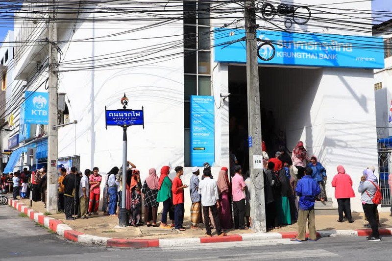 บรรยากาศวันแรก หลังธนาคารกรุงไทย ในพื้นที่อำเภอเมืองยะลา เปิดให้บริการประชาชนในการยืนยันสิทธิตามมาตรการ ชิม ช้อป ใช้ สำหรับผู้ที่ไม่ผ่านการสแกนใบหน้าด้วยตนเอง หลังจากได้รับ SMS ตั้งแต่เวลา 08.30 น.-16.30 น. ในวันหยุดเสาร์ อาทิตย์ พบว่า ยังคงมีประชาชนจำนวนมาก เดินทางมาเข้าคิวรอ ที่ด้านหน้าธนาคารกรุงไทย สาขารถไฟ เพื่อให้ทางธนาคาร ได้ยืนยันสิทธิ์ในการจับจ่ายใช้สอยตามมาตการ เป๋าตัง ชิมช้อปใช้