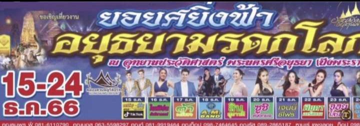 เชิญเที่ยวงานอยุธยางานมรดกโลก ยอยศยิ่งฟ้า ของดีของถูกมากมาย สวนอาหารสวนสนุก ค่ำคืนมีดนตรีไพเราะ โต๊ะไม้สักต่างๆ มีหลายประเภท จับจองซื้อ ซื้อของได้เลย งานนี้ใหญ่ที่สุด นักท่องเที่ยว มาชมซื้อของได้ กลางวันก็มีท่องเที่ยว โบราณสถาน เดินชมโบราณสถาน ช่วงกลางวันหรือช่วงกลางคืน มีของใช้จ่ายมากมายอาหารการกิน มาเที่ยวงานนี้ไม่ผิดหวัง สถานที่จอดรถ สะดวกสบาย มี อปพร ดูแลความสะดวก สถานที่จอดรถ มาแล้วไม่ผิดหวัง มีรถรางวิ่งรอบเมือง ของอำเภอต่างๆ และกลางคืนมีการประกวดร้องเพลง แต่ละอำเภอ มาชมกันได้ และซื้อบัตรกาชาดปีนี้ของมากมาย คอยต้อนรับพ่อแม่พี่น้อง มาเที่ยวงานอยุธยามรดกโลกยอยศยิ่งฟ้า อยุธยามรดกโลก 15-24 ธันวาคม 2566 อย่าลืมอย่าพลาดเชิญเที่ยวอยุธยา ปีนี้จัดยิ่งใหญ่ และใหญ่กว่าทุกปี