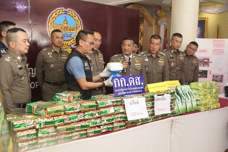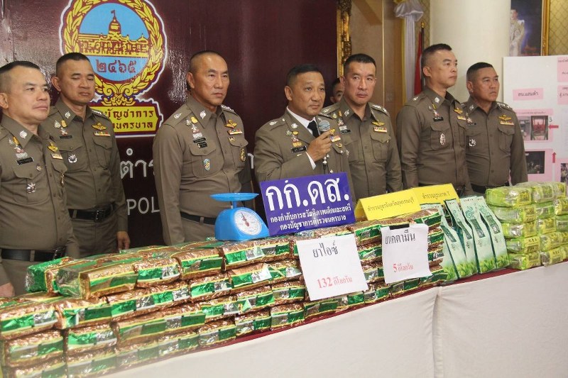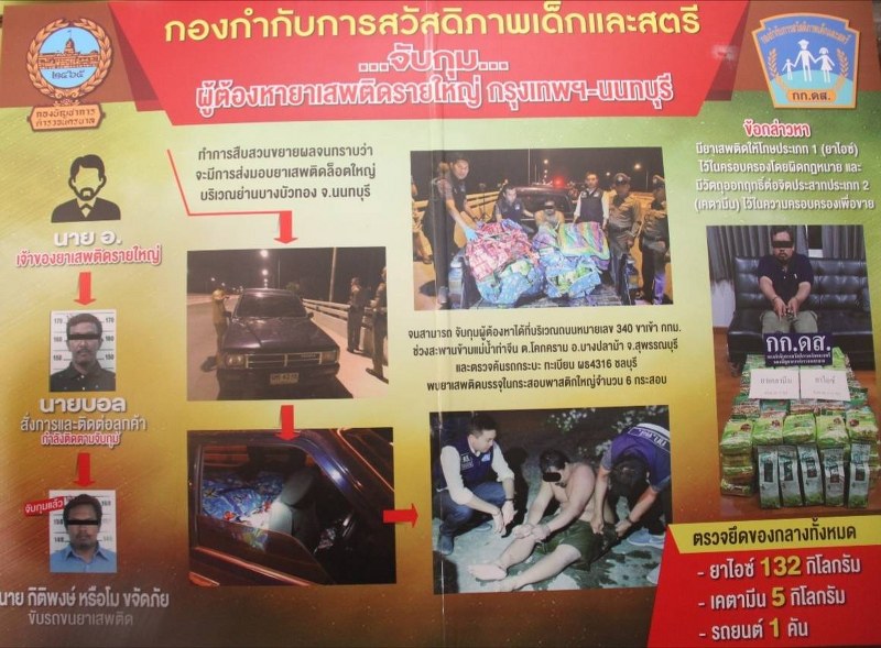 เจ้าหน้าที่ตำรวจจึงแสดงตัวเพื่อเข้าทำการจับกุม และนำตัวผู้ต้องหาไปตรวจค้นรถยนต์กระบะคันที่ผู้ต้องหาขับมาผลการตรวจค้นพบของกลางยาเสพติดให้โทษประเภท 1 เมทแอมเฟตามีน(ยาไอซ์) บรรจุอยู่ในห่อพลาสติก(ห่อใบชา) สีเขียว จำนวน 132 ห่อ น้ำหนักชั่งรวมภาชนะบรรจุหนักห่อละประมาณ 1 กิโลกรัม รวมน้ำหนักยาไอซ์ทั้งหมดประมาณ 132 กิโลกรัม และวัตถุออกฤทธิ์ต่อจิตประสาทประเภท 2 คีตามีน บรรจุอยู่ในห่อพลาสติกใบชาสีเขียวจำนวน 5 ห่อ น้ำหนักชั่งรวมภาชนะบรรจุหนักห่อละประมาณ 1 กิโลกรัม รวมน้ำหนักคีตามีนทั้งหมดหนักประมาณ 5 กิโลกรัม