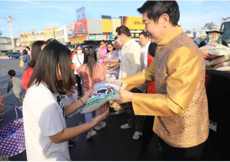 พร้อมกันนี้ได้ร่วมกันตักบาตรข้าวสารอาหารแห้งแด่พระภิกษุสงฆ์ สามเณร จำนวน 167 รูป รวมทั้งรับข้าวสารถุงละ 5 กิโลกรัมคนละ 1 ถุงและรับปฏิทินของปี 2567 เป็นไว้ที่ระลึก ซึ่งผู้มาร่วมพิธีในครั้งนี้ต่างมีใบหน้าที่ยิ้มแย้มแจ่มใส่ที่ได้มาร่วมพิธีทำบุญในครั้งนี้ ทั้งนี้เพื่อความเป็นสิริมงคลแก่ชีวิตและครอบครัวและการมอบข้าวสารยังเป็นการช่วยเหลือลดรายจ่ายและเป็นของขวัญปีใหม่ให้กับประชาชนให้มีคุณภาพชีวิตที่ดีขึ้น
