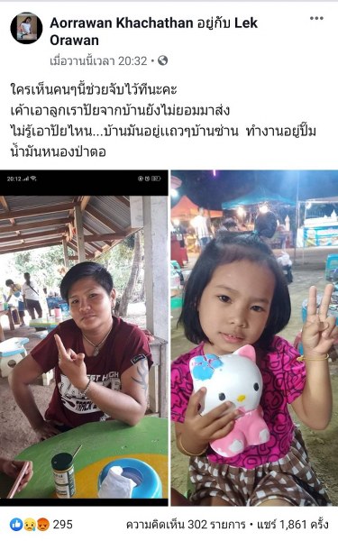จากกรณีผู้ใช้เฟสบุ๊คชื่อ Aorrawan Khachathan โพสข้อความเมื่อเวลา 20:32 น ว่า “ใครเห็นคนๆนี้ช่วยจับไว้ทีนะคะ เค้าเอาลูกเราปัยจากบ้านยังไม่ยอมมาส่ง ไม่รู้เอาไปไหนบ้านมันอยู่แถวๆบ้านซ่าน ทำงานอยู่ปั้มน้ำมันหนองป่าตอ”