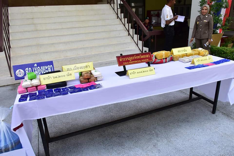 เมื่อวันที่ 14 ตุลาคม 2562 ที่กองบังคับการตำรวจภูธรจังหวัดยะลา พล.ต.ต.ปราบพาล มีมงคล ผู้บังคับการตำรวจภูธร จ.ยะลา พร้อมด้วยเจ้าหน้าที่ทหารหน่วยเฉพาะกิจยะลา และฝ่ายปกครอง ได้ร่วมกันแถลงข่าวการจับกุมยาเสพติด ตามนโยบายของรัฐบาล นโยบายของผู้บัญชาการตำรวจแห่งชาติ เกี่ยวกับการแก้ไขปัญหายาเสพติด โดยมีนโยบายมุ่งเน้นการแก้ไขปัญหายาเสพติดในทุกมิติ ประกอบกับ นโยบายการปรามปรามยาเสพติดในการแก้ไขปัญหาจังหวัดชายแดนภาคใต้ ของแม่ทัพภาคที่ 4 และคำสั่งผู้บัญชาการตำรวจภูธรภาค 9 สั่งการให้เจ้าหน้าที่ตำรวจในสังกัด ดำเนินการสืบสวนจับกุมเครือข่ายนักค้ายาเสพติดในพื้นที่ สำหรับการจับกุมในครั้งนี้ โดยการอำนวยการของ พล.ต.ท.รณศิลป์ ภู่สาระ ผบช.ภ.9 , จับกุมผู้ต้องหาคดียาเสพติดได้ 2 คดี จำนวนของกลางยาบ้า 104,200 เม็ด ดังนี้