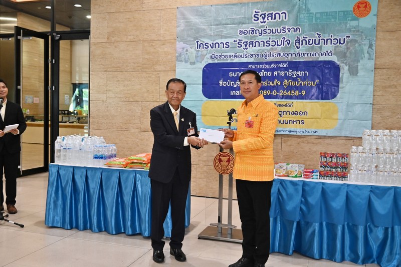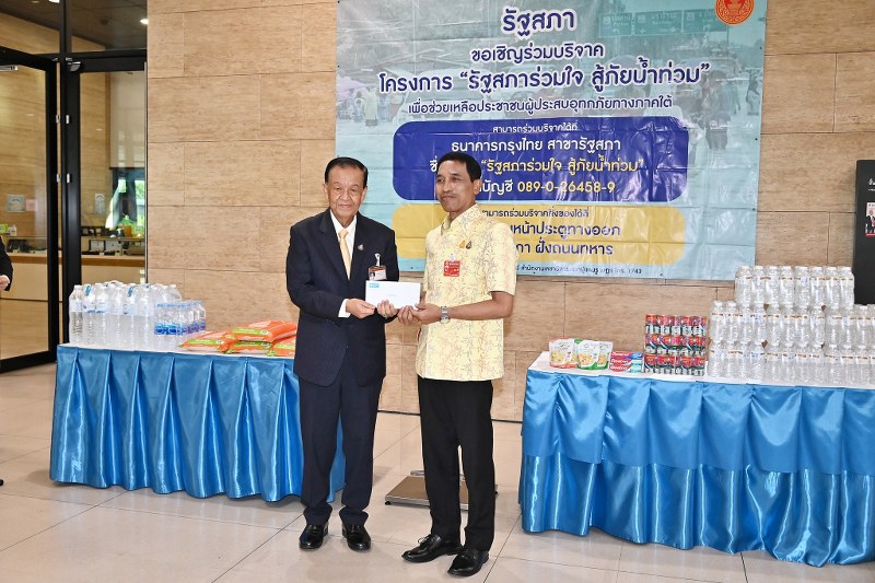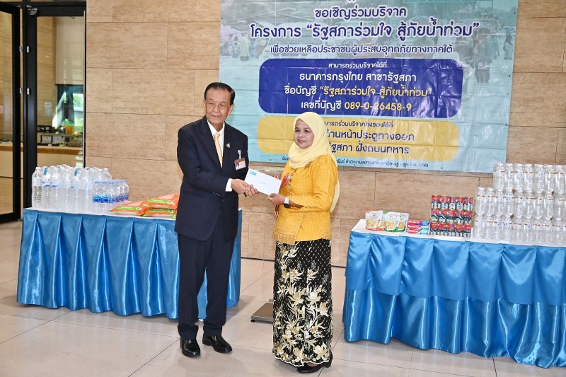 ประธานสภาผู้แทนราษฎร เป็นประธานในพิธีส่งมอบเงินและสิ่งของบริจาคช่วยเหลือผู้ประสบอุทกภัยทางภาคใต้ ให้แก่ผู้ว่าราชการจังหวัด จำนวน 3 จังหวัด ได้แก่ จ.ยะลา จ.นราธิวาส และ จ.ปัตตานี