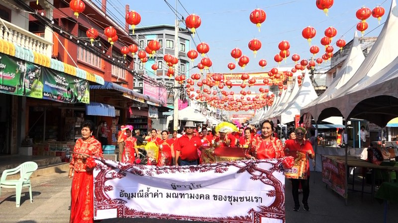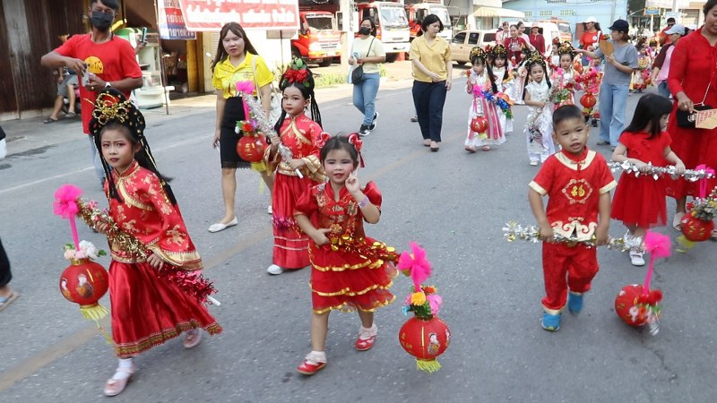 บรรยากาศบวนแห่ มีการแสดงแสดงการเชิดสิงโต การต่อตัวโดยหนูน้อยอายุกล้าหาญ ขบวนบุปผาชาติ โดยหนูน้อยชั้นอนุบาลเป็นคนหาบเดินในขบวน ระหว่างที่ขบวนแห่เดินไปรอบตลาดตลาดแม้จะเป็นช่วงเช้าแต่อากาศร้อนอบอ้าว ผู้ปกครองซึ่งสภาพอากาศพากันเตรียมตัวมาอย่างโดยการเอาพัดลมตัวเล็มมาเป่าให้บุตรหลาน บางคนก็ใช้พัด ช่วยผ่อนคลายความร้อน พอถึงช่วงที่สิงโตและมังกร และบรรดาสาวน้อยพันปีจากชมชรมผู้สูงอายุ แสดง ซึ่งต้องใช้เวลานาน บรรดาหนูน้อย และสาวรุ่น ยืนรอไม่ไหว ต้องเปลี่ยนอิริยาบทจากยืนเป็นนั่งกับพื้น โดยมีผู้ปกครองคอยเอาพัดลมามเป่า เอาพัดมาพัด ผู้ปกครองบางคนก็เอาลูกนั่งรถเข็น คอยถ่ายภาพเก็บความน่ารักไว้เป็นที่ระลึกกันไป