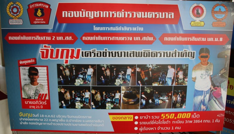 เจ้าหน้าที่ตำรวจจึงได้เฝ้าติดตามมาจนกระทั่งถึงปากซอยเทศบาล 22 ต.พญาเย็น อ.ปากช่อง จ.นครราชสีมา ผู้บังคับบัญชาจึงได้สั่งให้แสดงตัวเพื่อเข้าทำการตรวจค้น ผลการตรวจค้นพบ ยาบ้า บรรทุกมาภายในรถ ประมาณ 550,000 เม็ด เมื่อสอบถามผู้ต้องหาแล้วให้การรับสารภาพ ว่ายาเสพติด (ยาบ้า) ดังกล่าว ตนเองกับพวกที่หลบหนีได้รับว่าจ้างจากนายทุนให้นำยาเสพติดดังกล่าวไปส่งให้กับลูกค้าในกรุงเทพมหานคร และบริเวณใกล้เคียง ได้ค่าว่าจ้างครั้งนี้เป็นเงิน สองแสนบาท และรับว่ารับงานครั้งนี้เป็นครั้งที่ 3