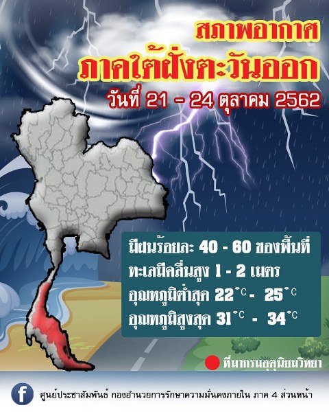 “สภาพอากาศภาคใต้ฝั่งตะวันออก ตั้งแต่วันทิ่ 21 – 24 ตุลาคม 2562” มีฝนตกร้อยละ 40 – 60 ของพื้นที่