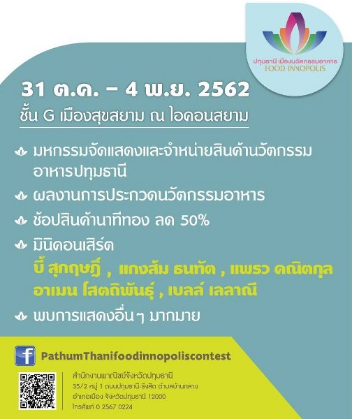 เชิญชมผลงานที่ชนะการประกวด พร้อมเลือกซื้อผลิตภัณฑ์นวัตกรรมอาหารหลากหลายของจังหวัดปทุมธานีได้ ในงาน “ปทุมธานี เมืองนวัตกรรมอาหาร” “Pathum Thani Food Innopolis” ระหว่างวันที่ 31 ตุลาคม–4 พฤศจิกายน 2562 ณ สุขสยาม ชั้น G ศูนย์การค้าไอคอนสยาม กรุงเทพฯ