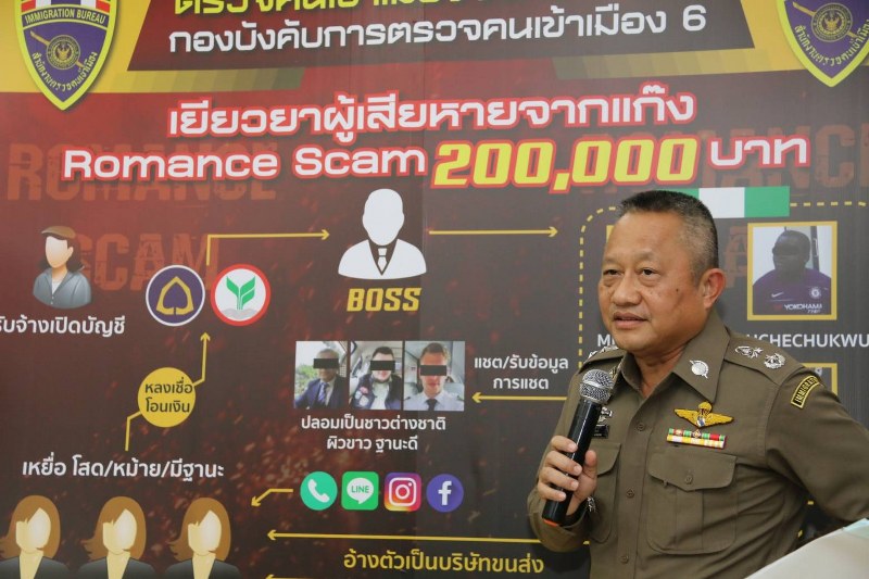 วันนี้ วันศุกร์ที่ 25 ต.ค.62 ณ ห้องประชุมมหาเมฆ ชั้น 4 อาคาร 1 สตม.สวนพลู สาธร กทม. : พล.ต.ต.พรชัย ขันตี รองผบช.สตม. พร้อมด้วย พล.ต.ต.พีรวัส บุญลอย ผบก.ตม.6, พ.ต.อ.อรุษ แสงจันทร์ รองผบก.ตม.6 แถลงข่าวการจับกุมเครือข่าย Romance Scam พบหญิงไทยร่วมขบวนการหลอกคนชาติตัวเอง