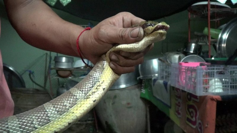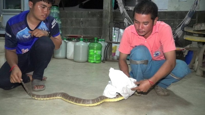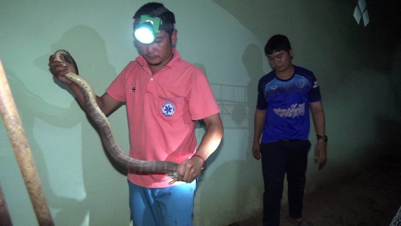 จากการสอบถาม นางสาวนันทิกานต์ บุญเสริม ลูกสาวเจ้าของบ้านเล่าว่า ขณะที่กำลังอยู่ในบ้าน ได้ยินเสียง เจ้าส้ม ซึ่งเป็นแมวเพศผู้ที่เลี้ยงไว้ กำลังส่งเสียงขู่และจ้องมองอะไรบางอย่าง พร้อมทำท่าทีใช้เท้าหน้าเขี่ยไปมา ตอนแรกตนคิดว่า เจ้าส้มกำลังหยอกล้อกับแมวตัวอื่น จึงเปิดไฟจากโทรศัพท์มือถือเพื่อส่องดู ก็ต้องตกใจสุดขีด เมื่อพบว่าสิ่งที่เจ้าส้มกำลังหยอกล้ออยู่นั้น ไม่ใช่แมวแต่เป็นงูขนาดใหญ่ ที่มีลักษณะไม่คุ้นชิน ซึ่งทราบต่อมาภายหลังว่าเป็นงูหัวกะโหลก หรือ งูเหลือมอ้อ จึงรีบวิ่งไปบอกพ่อกับแม่ให้มาดู พร้อมรีบอุ้มเจ้าส้มหนีออกมา หวั่นถูกงูฉกได้รับอันตรายได้ จากนั้นรีบโทรแจ้งเจ้าหน้าที่ เข้ามาช่วยเหลือจับงูได้สำเร็จ และปลอดภัย