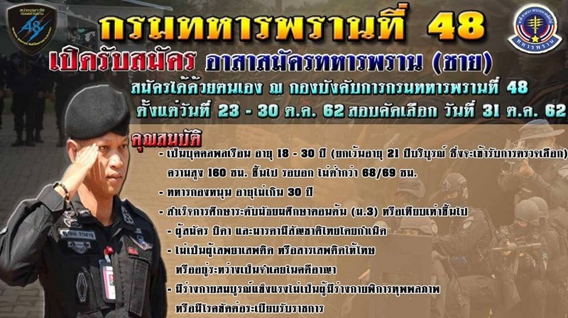 กรมทหารพรานที่ 48 เปิดรับสมัครอาสาสมัครทหารพราน (ชาย) เปิดรับสมัครตั้งแต่วันที่ 23-30 ต.ค.62 (ไม่เว้นวันหยุดราชการ) สามารถสมัครได้ด้วยตนเอง ณ กองบังคับการกรมทหารพรานที่ 48 ค่ายกรมหลวงนราธิวาสราชนครินทร์ หมู่ที่ 7 บ.ปิเหล็ง ต.มะรือโบออก อ.เจาะไอร้อง จ.นราธิวาส โทร 088-7542659