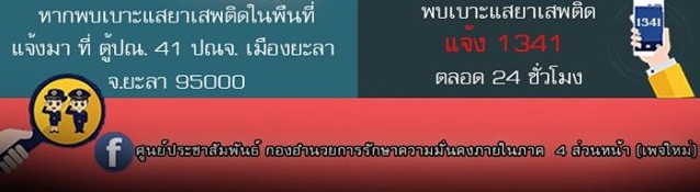 กอ.รมน.ภาค 4 ส่วนหน้า ขอความร่วมมือ พี่น้องประชาชน หากพบเบาะแสยาเสพติดในพื้นที่ ทั้งการซื้อ จำหน่าย หรือการเสพ ขอให้แจ้งมา ที่ ตู้ปณ. 41 ปณจ. เมืองยะลา จ.ยะลา ระบุเบาะแสให้ชัดเจนไม่ต้องลงชื่อแต่อย่างใด ยาเสพติด ภัยร้ายทำลายชีวิต ร่วมกันส่งคืนคนดีสู่อ้อมกอดของครอบครัว