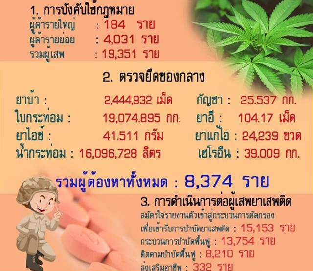- การบังคับใช้กฎหมาย สามารถดำเนินการบังคับใช้กฎหมาย ดังนี้ ผู้ค้ารายใหญ่ 184 ราย, ผู้ค้ารายย่อย 4,031 ราย รวมผู้เสพ 19,351 ราย