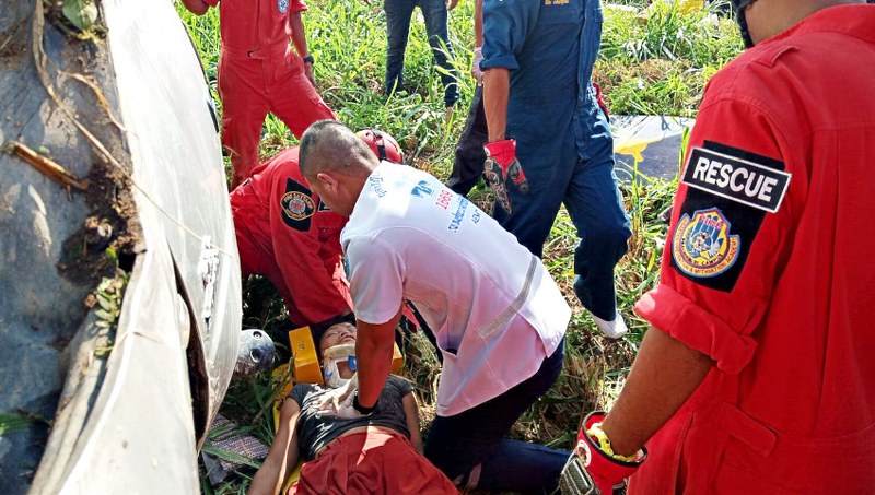 ที่เกิดเหตุเจ้าหน้าที่พบรถเก๋ง โตโยต้าไทเกอร์ 4 ประตู สีบอรน์ ทะเบียน ษจ-8259 กทม. ในสภาพพลิกคว่ำหงายท้อง อยู่ในร่องน้ำเกาะกลางถนน เจ้าหน้าที่ได้ช่วยเหลือนายทศพร ขยิ่ม อายุ 50 ปี สามี ออกมานอกตัวรถ ได้รับบาดเจ็บสาหัส ภายในรถพบร่าง นางบุษกร ขยิ่ม อายุ 52 ปี ภรรยาคนขับได้รับบาดเจ็บสาหัส อยู่ภายในรถ เจ้าหน้ากู้ภัยได้ใช้อุปกรณ์ตัดถ่างเพื่อช่วยเหลือ โดยมีเจ้าหน้าที่บริษัทกำลังติดตั้งป้ายสัญญานบริเวณถนนดังกล่าว ได้นำรถเครนมาช่วยยกรถนำตัวผู้ได้รับบาดเจ็บออกมา โดยใช้เวลากว่า 15 นาที จึงสามารถนำออกมาได้ ก่อนนำส่งโรงพยาบาลสมเด็จพระนางเจ้าสิริกิติ์ กรมแพทย์ทหารเรือ