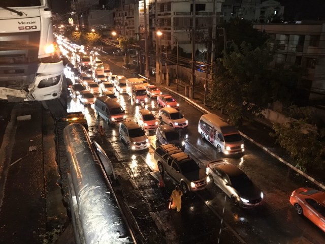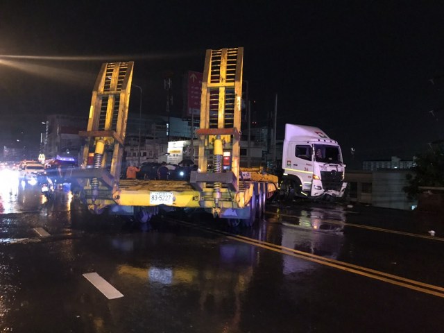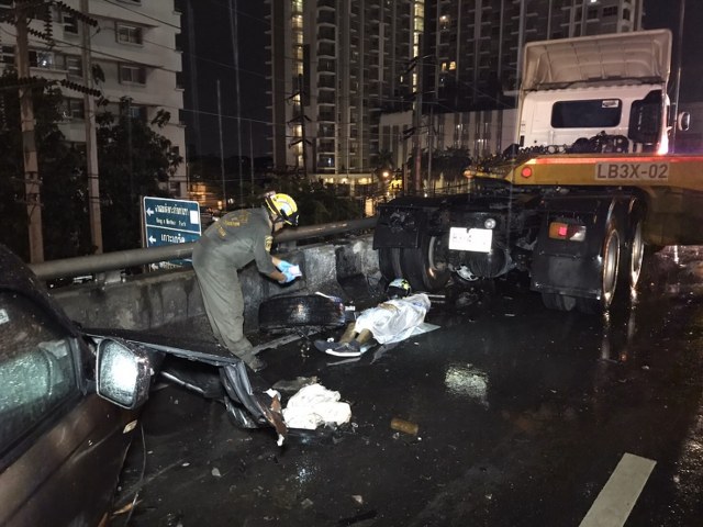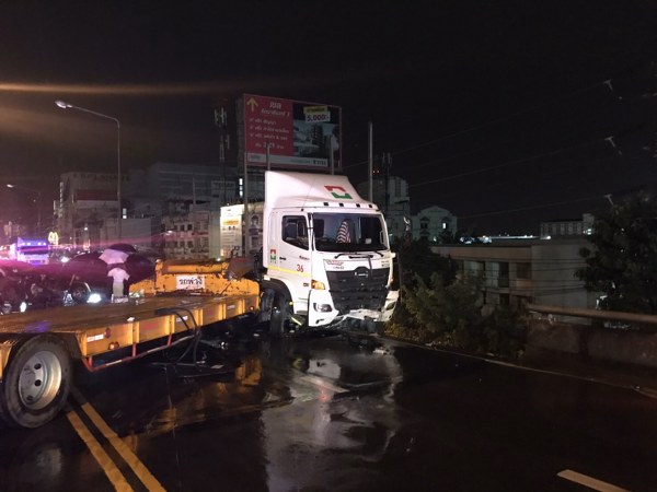 จากการตรวจสอบในที่เกิดเหตุ พบว่ามีรถบรรทุกพ่วง 18 ล้อ รถเก๋งและรถ จยย.ชนกันรวม 5 คัน สภาพตัวรถพ่วงชนราวสะพานที่เป็นคอนกรีต ทำให้แผ่นคอนคอนกรีตตกลงไปด้านล่าง ส่วนรถยนต์เก๋งและรถกระบะได้รับความเสียหายยับเยิน ขณะเดียวกันรถ จยย.ก็ถูกรถบรรทุกพ่วงทับอยู่ ผู้เสียชีวิตเป็นชายอายุประมาณ 30-35 ปี เป็นผู้ขับขี่รถ จยย.นอนเสียชีวิตอยู่ใต้รถบรรทุกพ่วงคันดังกล่าว เหตุการณ์นี้ทำให้มีผู้บาดเจ็บ 7 รายชาย 4 หญิง 3 กู้ภัยนำส่ง ร.พ.พระนั่งเกล้า และผู้เสียชีวิตเป็นชาย 1 ราย ซึ่งเหตุการณ์เกิดขึ้นในขณะที่มีฝนตก ลงมา อย่างหนักในพื้นที่ จ.นนทบุรี