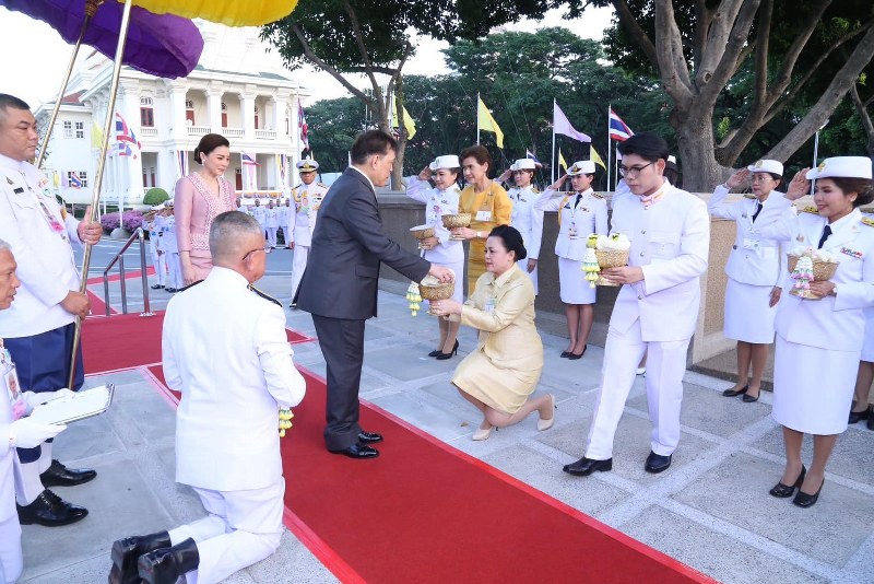 เมื่อเสด็จพระราชดำเนินถึง ศาสตราจารย์พิเศษสุรเกียรติ์ เสถียรไทย นายกสภาจุฬาลงกรณ์มหาวิทยาลัย, ศาสตราจารย์วิเลิศ ภูริวัชร อธิการบดีจุฬาลงกรณ์มหาวิทยาลัย, พลเอก ทรงวิทย์ หนุนภักดี ผู้บัญชาการทหารสูงสุด พร้อมด้วยผู้บัญชาการเหล่าทัพ และผู้บริหารจุฬาลง กรณ์มหาวิทยาลัย เฝ้าทูลละอองธุลีพระบาทรับเสด็จ จากนั้นเสด็จขึ้นบนลานพระบรมราชานุสาวรีย์สมเด็จพระปิยมหาราช และสมเด็จพระมหาธีรราชเจ้า ทรงวางพุ่มดอกไม้ ทรงวางพวงมาลัย ทรงจุดธูปเทียนเครื่องทองน้อยถวายราชสักการะ ทรงกราบ