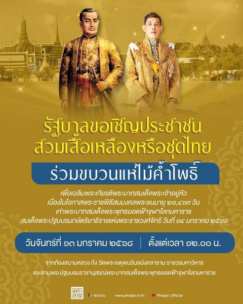 รัฐบาลขอเชิญชวนประชาชนสวมเสื้อเหลืองหรือชุดไทยร่วมขบวนแห่ไม้ค้ำโพธิ์ เพื่อเฉลิม พระเกียรติพระบาทสมเด็จพระเจ้าอยู่หัว เนื่องในโอกาสพระราชพิธีสมมงคลพระชนมายุ ๒๖,๔๖๙ วัน เท่าพระบาทสมเด็จพระพุทธยอดฟ้าจุฬาโลกมหาราช สมเด็จพระปฐมบรมกษัตริยาธิราชแห่งพระราชวงศ์จักรี วันที่ ๑๔ มกราคม ๒๕๖๘ ในวันจันทร์ที่ ๑๓ มกราคม ๒๕๖๘