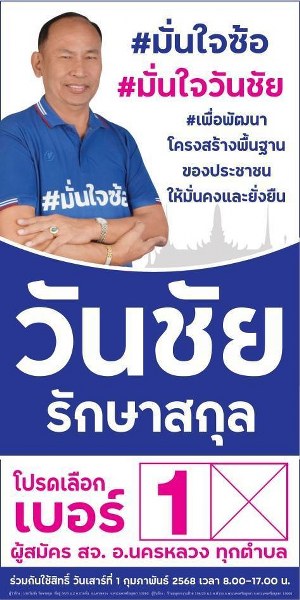 วันนี้เวลา 10.30 น. วันที่ 17 มกราคม 2568 เดินหาเสียง ทักทายประชาชน ให้ออกมา ลงคะแนน ในวันเสาร์ที่ 1 กุมภาพันธ์ 2568 ในเขตท้องที่อำเภอนครหลวง จังหวัดพระนครศรี อยุธยา และยังมีคู่แข่งของพรรคประชาชนและพรรคเพื่อไทย ในครั้งนี้ นายวันชัย รักษาสกุล หมายเลข 1 เป็นผู้สมัครอิสระ ซึ่งออกหาเสียง ทักทายประชาชน ในเขต 12 ตำบล 74 หมู่บ้าน 42 วัด ในเขตอำเภอนครหลวงทุกอำเภอ งานนี้คึกคัก งานนี้แพ้ไม่ได้ อดีตสจวันชัย รักษาสกุล ผู้สมัครอิสระ งานนี้มั่นใจซ้อมั่นใจวันชัย เพื่อพัฒนาโครง สร้างพื้นฐานของประชาชน ให้มั่นคงและยั่งยืน