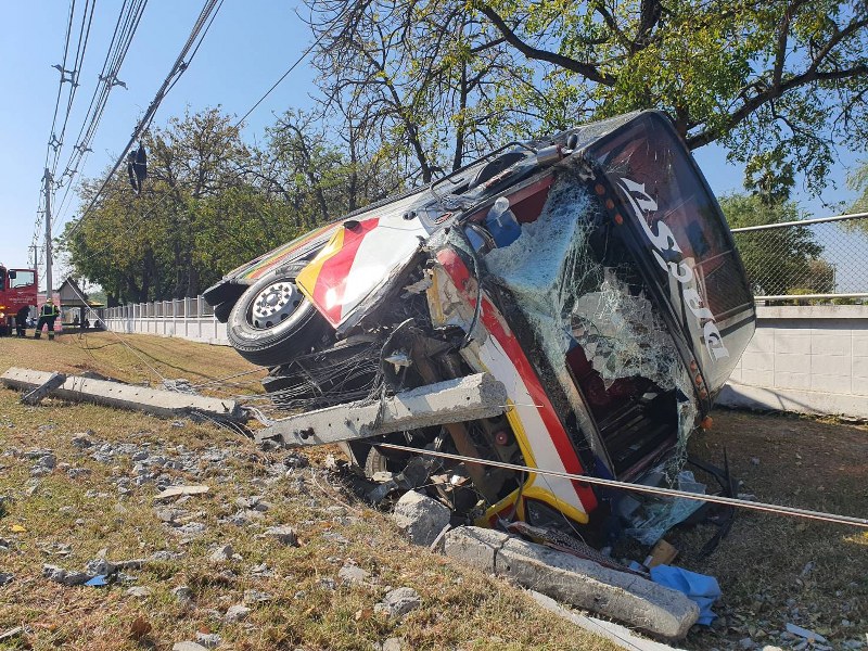 จังหวัดลพบุรี – เจ้าหน้าที่กู้ภัยฯ การไฟฟ้า รถดับเพลิง เร่งเข้าพื้นที่จากรถบัสรับส่งพนักงานเสียหลักพุ่งชนเสาไฟฟ้าขนาดใหญ่ริมถนนขาดกระเด็น คนขับติดในรถต้องช่วยระทึกเนื่องจากไม่สามารถตัดกระแสไฟฟ้าได้ อีกทั้งน้ำมันรถรั่วไหลนอง ต้องทำงานแข่งเวลาด้วยความระมัดระวัง
