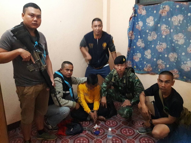 บ้านเป้าหมายดังกล่าว จัดกำลังซุ่มติดตามพฤติกรรมบุคคลเป้าหมาย พบชายวัยรุ่น 2 คน ขับขี่รถจักรยานยนต์โซนิค สีแดง ไม่ติดแผ่นป้ายทะเบียน ซ้อนท้านกันมาจอดยังบริเวณหน้าบ้านดังกล่าว เจ้าหน้าที่จึงแสดงตัวเพื่อขอตรวจค้น เมื่อวัยรุ่นทั้ง 2 เห็น เจ้าหน้าที่แสดงพิรุธพยามวิ่งเข้าไปในบ้านเจ้าหน้าที่จึงควบคุมตัววัยรุ่นทั้ง 2 ก่อนทราบชื่อนายอมรฤทธิ์ ซามงค์ อายุ 19 ปี บ้านเลขที่ 87 บ้านดอนตาล ม.1 ต.ดอนตาล อ.ดอนตาล จ.มุกดาหาร และนายจิรายุทธ พิมพ์ภา อายุ 20 ปี บ้านเลขที่ 327 บ้านตาลรุ่ง ม.7 ต.บ้านดอนตาล อ.ดอนตาล จ.มุกดาหาร
