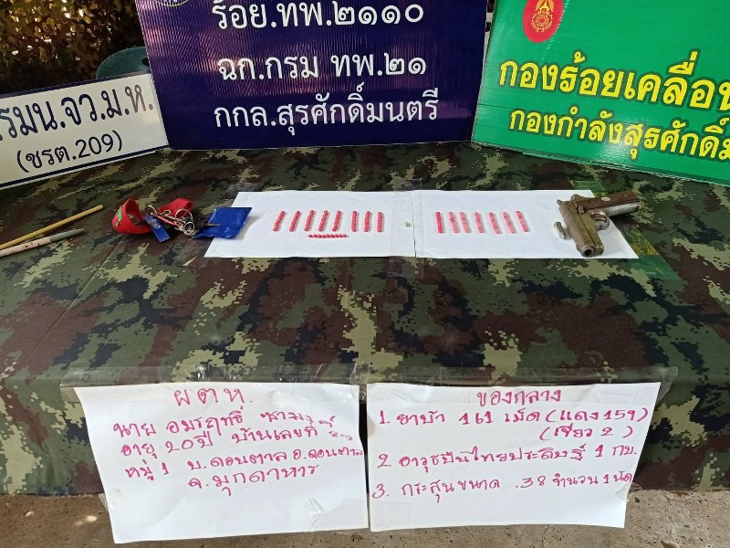 มุกดาหาร กองร้อยทหารพราน ร่วมฝ่ายความมั่นคง กอ.รมน. กองกำลังสุรศักดิ์มนตรี และฝ่ายปกครอง อ.ดอนตาล จับกุม 2 วัยรุ่น ถูกเจ้าหน้าที่บุกจับคาบ้าน พร้อมของกลางยาบ้า 161 เม็ด อาวุธปืนไทยประดิษฐ์ขนาด .38 กระสุน 1 นัด