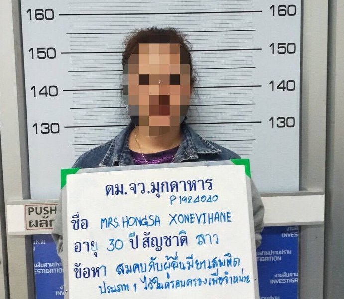 เมื่อวันที่ 7 พฤศจิกายน 2562 เวลา 16.30 น. ภายใต้อำนวยการสั่งการของ พ.ต.อ. ชนะพณ สุวรรณศรีนนท์ ผกก.ตม.จว.มุกดาหาร บก.ตม.4, พ.ต.ท.ธีรวัฒน์ ทิพย์ธนาวิวัฒ รอง ผกก.ตม.จว.มุกดาหาร บก.ตม.4, พ.ต.ท.ยศพร มาศรีนวล และ พ.ต.ท.อุดร ชาวแขก สว.ตม.จว.มุกดาหาร บก.ตม.4 โดยเจ้าหน้าที่ชุดสืบสวนปราบปราม ร่วมกับเจ้าหน้าที่จุดตรวจบุคคลและพาหนะ และเจ้าหน้าที่ สภ.พิมายได้ทำการจับกุม MRS.HONGSA XONEVIHANE อายุ 30 ปี สัญชาติ ลาว ถือหนังสือเดินทาง เลขที่ P 1924040 ตามหมายจับศาลจังหวัดพิมาย ที่ จ. 19/2558 ลงวันที่ 3 สิงหาคม 2558 ข้อหา “สมคบกับผู้อื่นมียาเสพติดให้โทษประเภท 1 (เมทแอมเฟตามีน) ตั้งแต่สิบห้าหน่วยการใช้ (เมทแอมเฟตามีน จำนวน 8,600(แปดพันหกร้อย) เม็ด/หน่วยการใช้) ขึ้นไป ซึ่งมีปริมาณคำนวณเป็นน้ำหนักสารบริสุทธิ์เกินยี่สิบกรัม (สารบริสุทธิ์ 136.595 (หนึ่งร้อยสามสิบหกจุดห้าเก้า)กรัมขึ้นไป หรือมีน้ำหนักตั้งแต่หนึ่งจุดห้ากรัมหรือมีสารดังกล่าวผสมอยู่จำนวนสิบห้าหน่วยการใช้) ขึ้นไป ไว้ในความครอบครองเพื่อจำหน่ายโดยฝ่าฝืนต่อกฎหมาย” โดยจับกุมได้ที่บริเวณจุดตรวจบุคคลและพาหนะสะพานมิตรภาพ 2 ต.บางทรายใหญ่ อ.เมืองมุกดาหาร จ.มุกดาหาร