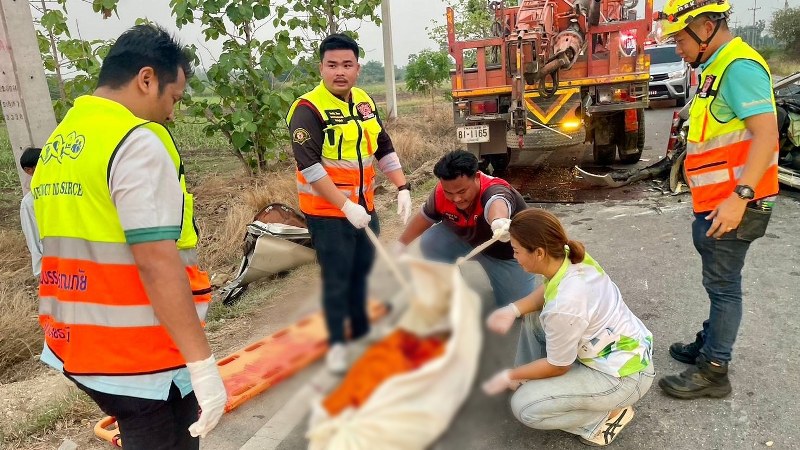 อุทัยธานี – พระควบเก๋งชนท้ายรถเครนขุดเจาะเสาไฟฟ้า ทำเอาพระนั่งมาในรถ ดับ 1 สาหัส 3 ราย