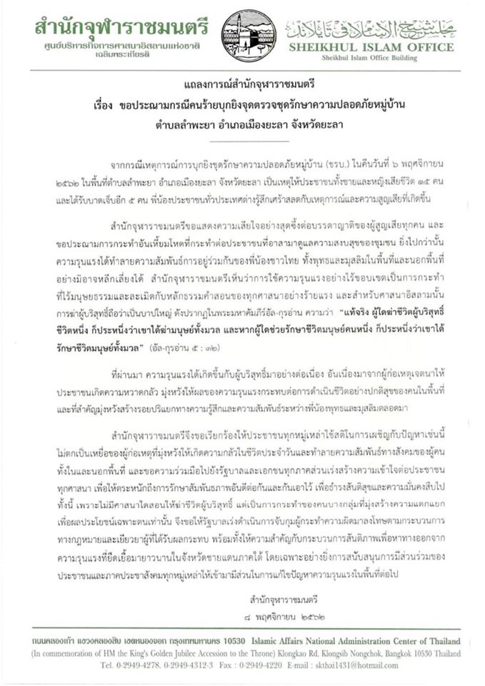 จากกรณีเหตุการณ์การบุกยิงชุดรักษาความปลอดภัยหมู่บ้าน (ชรบ) ในคืนวันที่ ๖ พฤศจิกายน ๒๕๖๐ในพื้นที่ ตำบลลำพะยา อำเภอเมืองยะลา จังหวัตยะลา เป็นเหตุให้ประชา ชนทั้งชายและหญิงเสียชีวิต ๑๕ คน และได้รับบาดเจ็บอีก ๕ คน พี่น้องประชาชน ทั้งประเทศต่างรู้สึกเศร้าสลดกับเหตุการณ์และความสูญเสียที่เกิดขึ้น สำนักจุฬาราชมนตรีขอแสดงความเสียใจอย่างสุดซึ้งต่อบรรดาญาติของผู้สูญเสียทุกคน และขอประณามการกระทำอันเหี้ยมโหดที่กระทำต่อประชาชนที่อาสามาดูแลความสงบสุขของชุมชน ยิ่งไปกว่านั้น ความรุนแรงได้ทำลายความสัมพันธ์การอยู่ร่วมกันของพี่น้องชาวไทยทั้งพุทธและมุสลิมในพื้นที่และนอกพื้นที่ อย่างมิอาจหลีกเลี่ยงได้ สำนักจุฬาราชมนตรีเห็นวงการใช้ความรุนแรงอย่างไร้ขอบเขต เป็นการกระทำที่ไร้มนุษยธรรมและละเมิดกับหลักธรรมคำสอนของทุกศาสนาอย่างร้ายแรงและสำหรับศาสนาอิสลามนั้น การมีผู้บริสุทธิ์ถือว่าเป็นบาปใหญ่ดังปรากฏในพระมหาคัมภีอัลกุรอ่าน ความว่า “แท้จริงผู้ใดฆ่าชีวิตผู้บริสุทธิ์ชีวิตหนึ่งก็ประหนึ่งว่าเขาได้ฆ่ามนุษย์ทั้งมวลและหากผู้ใดช่วยรักษาชีวิตมนุษย์คนหนึ่ง ก็ประหนึ่งว่าเขาได้รักษาชีวิตมนุษย์ทั้งมวล” (อัลกุรอ่าน ๕:๓๒) ที่ผ่านมา ความรุนแรงได้เกิดขึ้นกับผู้บริสุทธิ์มาอย่างต่อเนื่อง อันเนื่องมาจากผู้ก่อเหตุเจตนาให้ประชาชนเกิดความหวาดกลัว มุ่งหวังให้ผลของความรุนแรงกระทบต่อการดำเนินชีวิตอย่างปกติสุขของคนในพื้นที่ และที่สำคัญมุ่งหวังสร้างรอยปริแยกทางความรู้สึกและความสัมพันธ์ระหว่างพี่น้องพุทธและมุสลิมตลอดมา