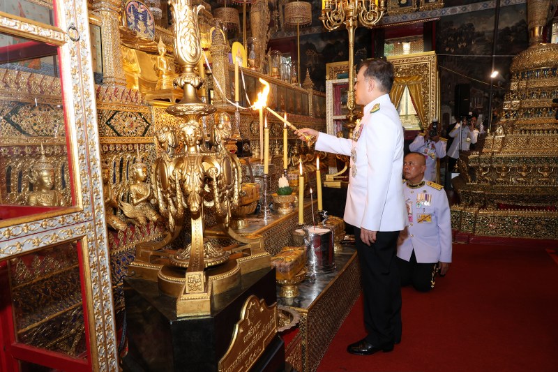 จากนั้น พระบาทสมเด็จพระเจ้าอยู่หัว ทรงจุดธูปเทียนเครื่องนมัสการทองใหญ่ที่หน้าธรรมาสน์ศิลา และสมเด็จพระนางเจ้า ฯ พระบรมราชินี ทรงจุดธูปเทียนเครื่องนมัสการทองทิศที่หน้าธรรมาสน์ศิลา ทรงกราบ ทรงศีล พระราชาคณะประธานสงฆ์ถวายศีล จบแล้ว เสด็จพระราชดำเนินไปยังธรรมาสน์ศิลา ทรงพระสุหร่ายสรงพระพุทธปฏิมาชัยวัฒน์ รัชกาลที่ ๙
