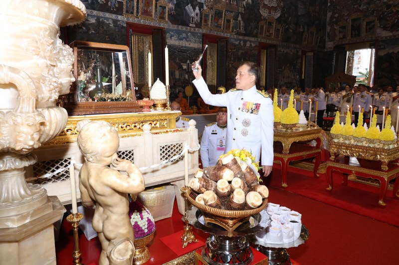 พระบาทสมเด็จพระเจ้าอยู่หัว และสมเด็จ พระนางเจ้า ฯ พระบรมราชินี เสด็จพระราชดำเนินไปในการพระราชพิธีพืชมงคล พุทธศักราช ๒๕๖๘ ณ พระอุโบสถวัดพระศรีรัตนศาสดาราม พระบรมมหาราชวัง