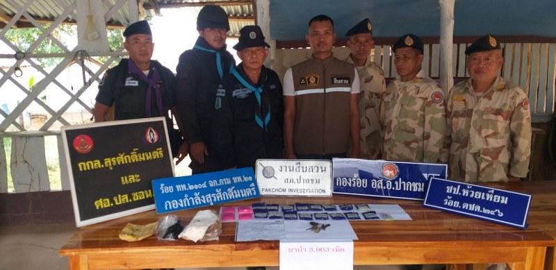 เมื่อวันที่ 9 พ.ย.62 กองกำลังสุรศักดิ์มนตรี โดย กองร้อยเฉพาะกิจกรมทหารพรานที่ 2104 หน่วยเฉพาะกิจกรมทหารพรานที่ 21 ได้จัดกำลังพล สนธิกำลังร่วมกับหน่วยความมั่นคงในพื้นที่ ทำการลาดตระเวนเฝ้าตรวจ บริเวณพื้นที่ริมถนนหมายเลข 211 บ.ห้วยเหียม – บ.ห้วยขอบ ต.หาดคัมภีร์ อ.ปากชม จ.เลย. กระทั่งถึงเวลา 20.10 น. ตรวจพบ ชาย 1 คน ยืนอยู่ข้างรถจักรยานยนต์ (จอดอยู่บริเวณริมถนนหมายเลข 211) พื้นที่ บ.ห้วยเหียม ต.หาดคัมภีร์ อ.ปากชม จ.เลย จึงได้แสดงตัวขอเข้าตรวจสอบชายคนดังกล่าว เมื่อชายคนดังกล่าวเห็น เจ้าหน้าที่จึงได้โยนถุงพลาสติกที่ถืออยู่ทิ้ง แล้วอาศัยความมืดวิ่งหลบหนีไปได้ เจ้าหน้าที่จึงได้เข้าตรวจสอบพื้นที่ดังกล่าว