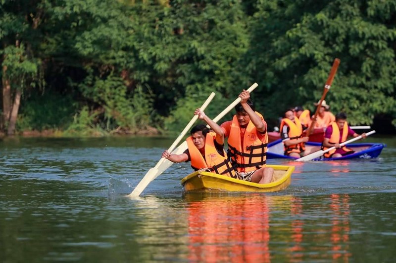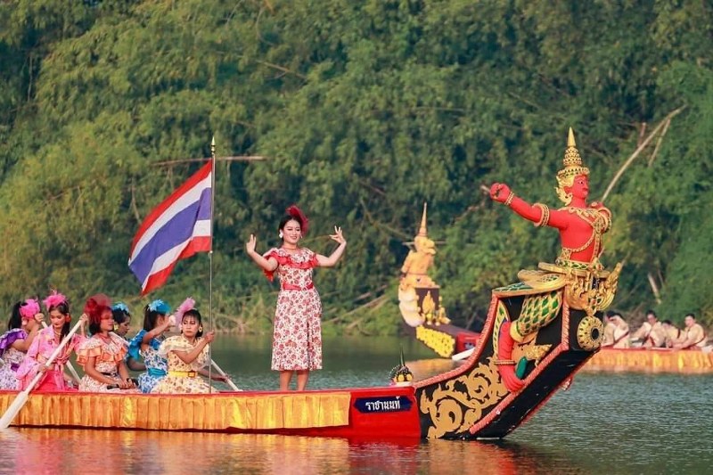 ในขบวนเรือจะมีการร้องรำทำเพลงสร้างความสนุกสนาน โดยวงปี่พาทย์บรรเลง และนางรำแต่งตัวสวยสดงดงามร่ายรำอยู่บริเวณหัวเรือ โดยมีเรือบริวารคอยรับปัจจัยศรัทธาร่วมบุญจากชาวบ้านตลอดสองฝั่งลำน้ำ สำหรับประเพณีดังกล่าวได้สูญหายไปจากชุมชนเป็นเวลากว่า 50ปี จึงมีการรื้อฟื้นขึ้นมาอีกครั้งเมื่อปี2555 โดยมีการเพิ่มเติมกิจกรรม เช่นการเห่เรือสวยงาม การแข่งขันกีฬาทางน้ำเพื่อความสนุกสนานอีกด้วย