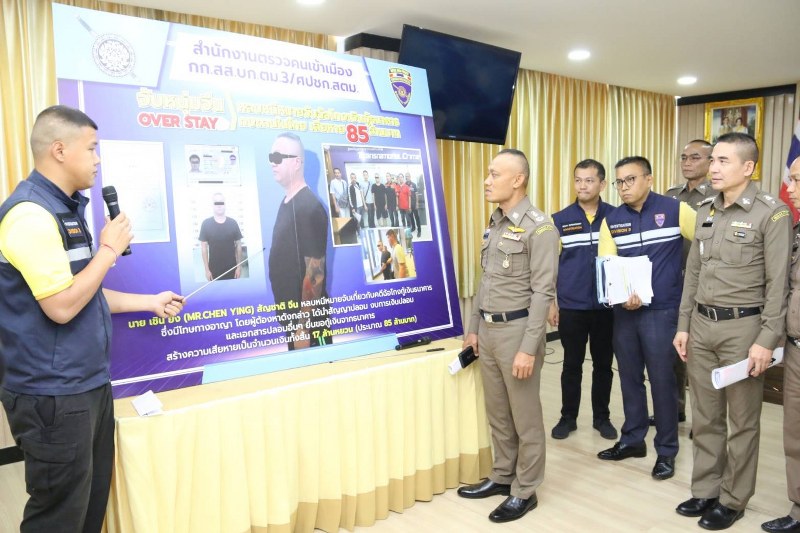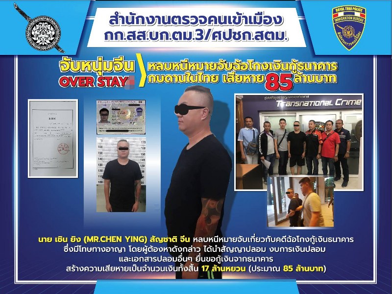 วันอังคารที่ 12 พ.ย.62 เวลา 13.00 น. ณ ห้องประชุมมหาเมฆ ชั้น 4 อาคาร 1 สำนักงานตรวจคนเข้าเมือง (สตม.) สวนพลู : พล.ต.ต.สุรพงษ์ ชัยจันทร์ รอง ผบช.สตม. พร้อมด้วย พล.ต.ต.อาชยน ไกรทอง ผบก.ตม 3, พ.ต.อ.ภาส สิริสุขะ รอง ผบก.ตม.3, พ.ต.อ.รัชธพงศ์ เตี้ยสุด ผกก.สส.บก.ตม.3 แถลงผลการจับกุมคดีสำคัญ เนื่องด้วยได้รับการประสานจาก สถานเอกอัครราชทูตสาธารณรัฐประชาชนจีน (สอท.จีน) ว่า นาย เชิน (MR.CHEN) สัญชาติ จีน อายุ 45 ปี ผู้ต้องหาสัญชาติจีน ได้หลบหนีหมายจับ เกี่ยวกับคดีฉ้อโกงกู้เงินธนาคาร ซึ่งมีโทษทางอาญา โดยเมื่อประมาณปี 2556 ผู้ต้องหาดังกล่าว ได้นำสัญญาปลอม งบฯการเงินปลอม และเอกสารปลอมอื่นๆ ยื่นขอกู้เงินจากธนาคาร สร้างความเสียหายเป็นมูลค่าประมาณ 85 ล้านบาท และเมื่อวันที่ 27 มีนาคม 2557 ผู้ต้องหาเดินทางออกจากประเทศจีน และสำนักงานอัยการเมืองฝูอันได้อนุมัติออกหมายจับคดีฉ้อโกงเมื่อวันที่ 23 สิงหาคม 2560 แล้ว