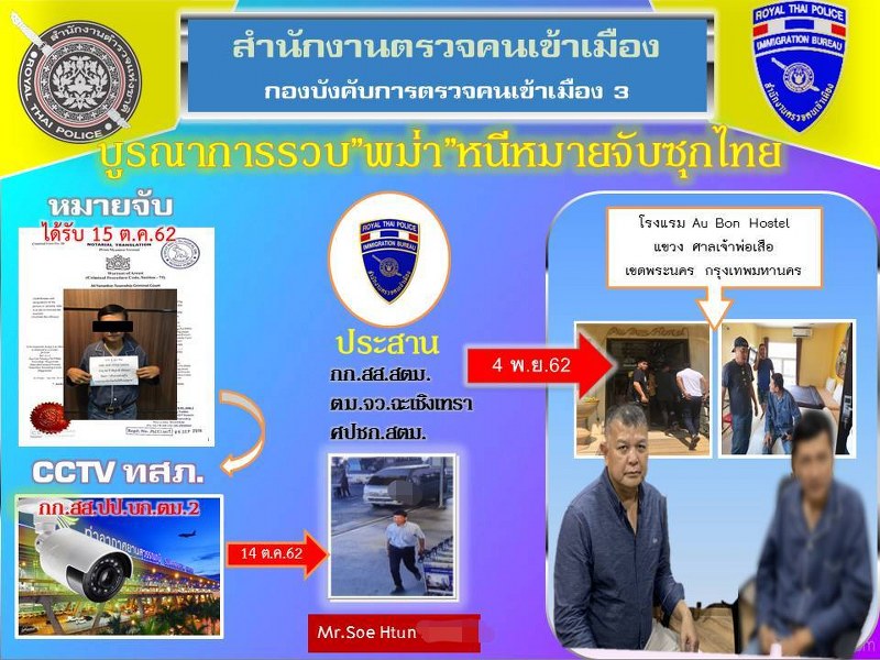จากการตรวจสอบกล้องวงจรปิด พบนาย Soe Htun บุคคลตามหมายจับที่บริเวณท่าอากาศยานสุวรรณภูมิ จึงเชื่อได้ว่า นาย Soe Htun ได้หลบหนีเข้ามาในประเทศไทยโดยผิดกฎหมาย จากนั้นได้ประสานศูนย์ปราบปรามคนร้ายข้ามชาติและเข้าเมืองผิดกฎหมายสำนัก งานตรวจคนเข้าเมือง (ศปชก.สตม.) ร่วมบูรณาการกำลัง สืบสวนติดตามจนทราบว่านาย Soe Htun ได้เข้าพักที่โรงแรมแห่งหนึ่ง แขวง ศาลเจ้าพ่อเสือ เขตพระนคร กรุงเทพมหานคร จึงได้เข้าควบคุมตัวเพื่อดำเนินคดีตามกฎหมายต่อไป